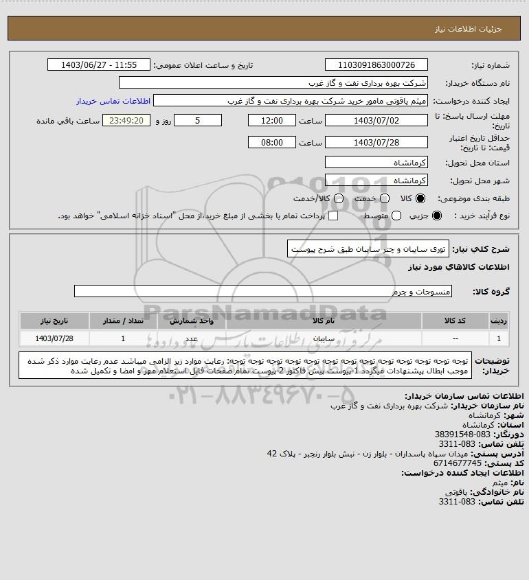 شرح کلی نیاز: توری سایبان و چتر سایبان طبق شرح پیوست