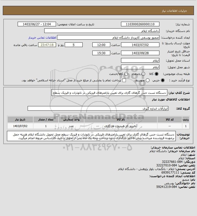| 1 | -- | آنالیزور گاز هیدروژن فاز-گازی | عدد | 1 | 1403/07/02 |