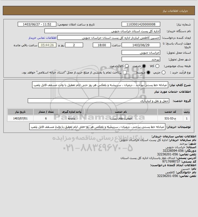 شرح کلی نیاز: مبادله خط پستی بیرجند ، درمیان ، سربیشه و بلعکس هر روز حتی ایام تعطیل با وانت مسقف قابل پلمپ