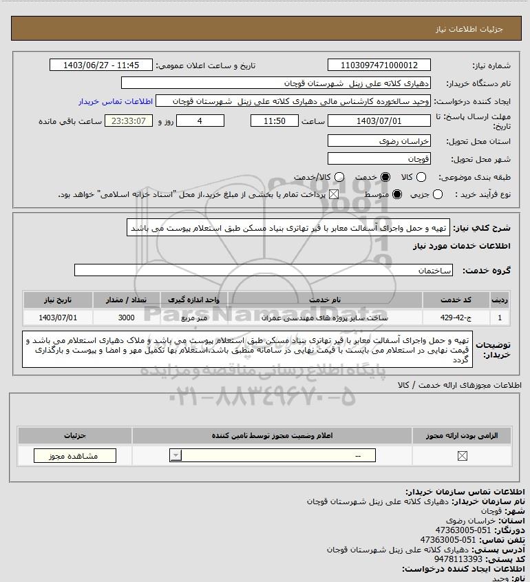 توضیحات خریدار:تهیه و حمل واجرای آسفالت معابر با قیر تهاتری بنیاد مسکن طبق استعلام پیوست می باشد و ملاک دهیاری استعلام می باشد و قیمت نهایی در استعلام می بایست با قیمت نهایی در سامانه منطبق باشد.استعلام بها تکمیل مهر و امضا و پیوست و بارگذاری گردد