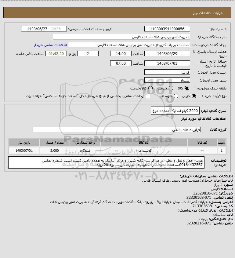 | 1 | -- | گوشت مرغ | کیلوگرم | 2,000 | 1403/07/01 |
