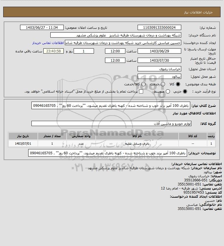 شرح کلی نیاز: باطری 100 آمپر برند خوب و شناخته شده - کهنه باطری تقدیم میشود، ""پرداخت 60 روز"" . 09046165705