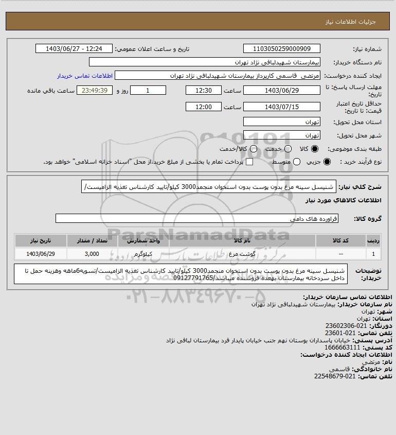 توضیحات خریدار: شنیسل سینه مرغ بدون پوست بدون استخوان منجمد3000 کیلو/تایید کارشناس تغذیه الزامیست/تسویه6ماهه وهزینه حمل تا داخل سردخانه بیمارستان بهعده فروشنده میباشد/09127791765