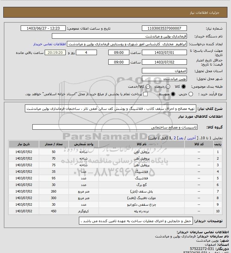 شرح کلی نیاز: تهیه مصالح و اجرای سقف کاذب ، فلاشینگ و پوشش کف سالن آمفی تاتر ، ساختمان فرمانداری بوئین میاندشت