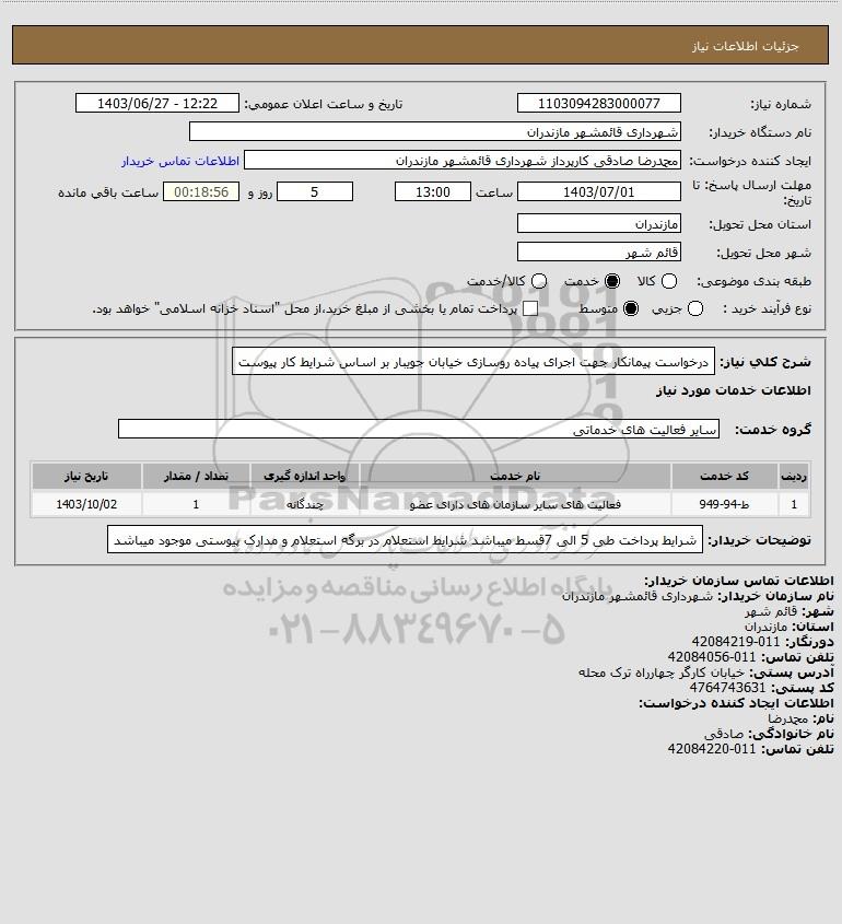 شرح کلی نیاز: درخواست پیمانکار جهت اجرای پیاده روسازی خیابان جویبار بر اساس شرایط کار پیوست