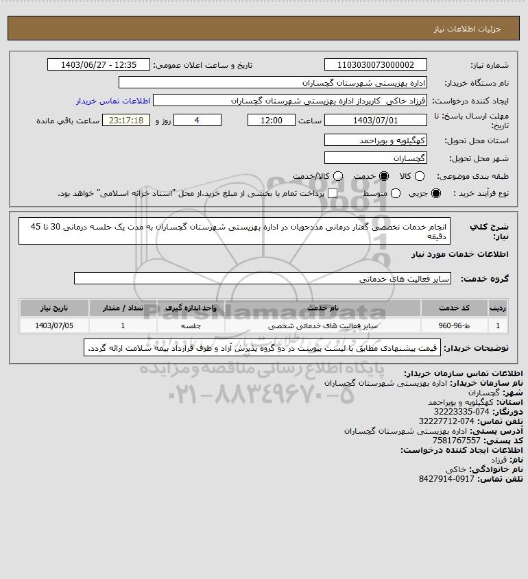 شرح کلی نیاز: انجام خدمات تخصصی گفتار درمانی مددجویان در اداره بهزیستی شهرستان گچساران به مدت یک جلسه درمانی 30 تا 45 دقیقه