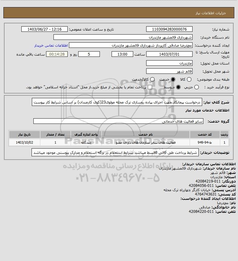 شرح کلی نیاز: درخواست پیمانکار جهت اجرای پیاده روسازی ترک محله مولوی23(کوی کارمندان) بر اساس شرایط کار پیوست