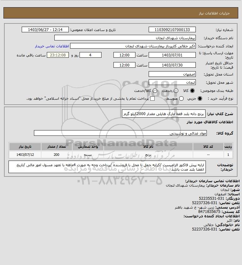 شرح کلی نیاز: برنج دانه بلند فقط مارک هایلی مقدار 2000کیلو گرم