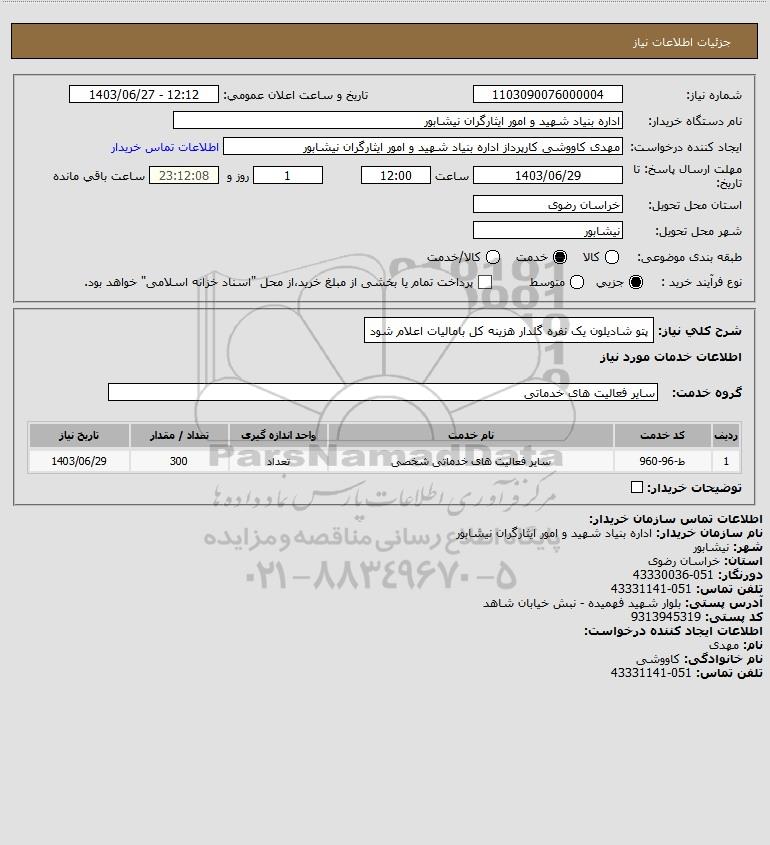 نام دستگاه خریدار:اداره بنیاد شهید و امور ایثارگران نیشابور