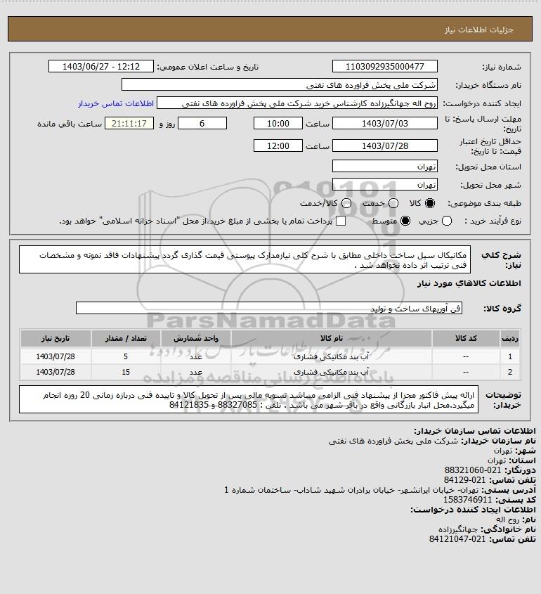 شرح کلی نیاز: مکانیکال سیل ساخت داخلی مطابق با شرح کلی نیازمدارک پیوستی قیمت گذاری گردد پیشنهادات فاقد نمونه و مشخصات فنی ترتیب اثر داده نخواهد شد .