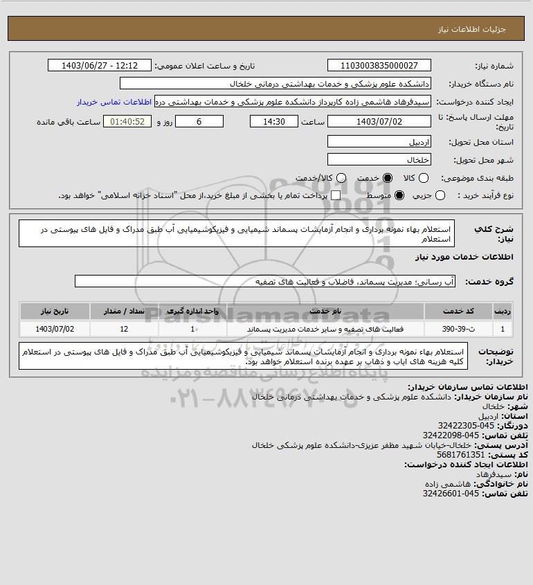 استعلام استعلام بهاء نمونه برداری و انجام آزمایشات پسماند شیمیایی و فیزیکوشیمیایی آب طبق مدراک و فایل های پیوستی در استعلام, استعلام استعلام بهاء نمونه برداری و انجام آزمایشات پسماند شیمیایی و فیزیکوشیمیایی آب طبق مدراک و فایل های پیوستی در استعلام