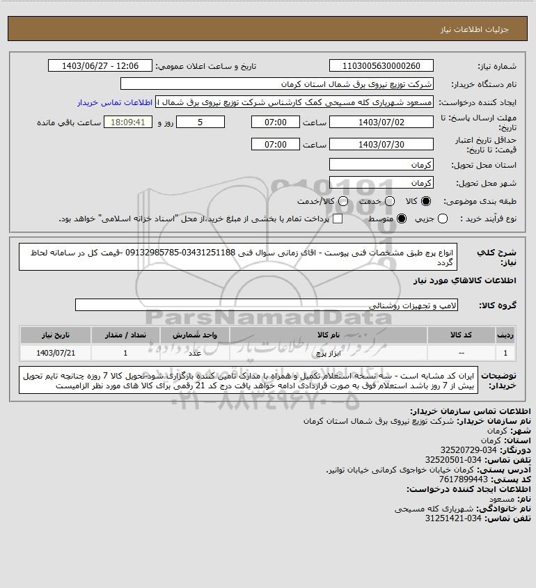 نام دستگاه خریدار:شرکت توزیع نیروی برق شمال استان کرمان