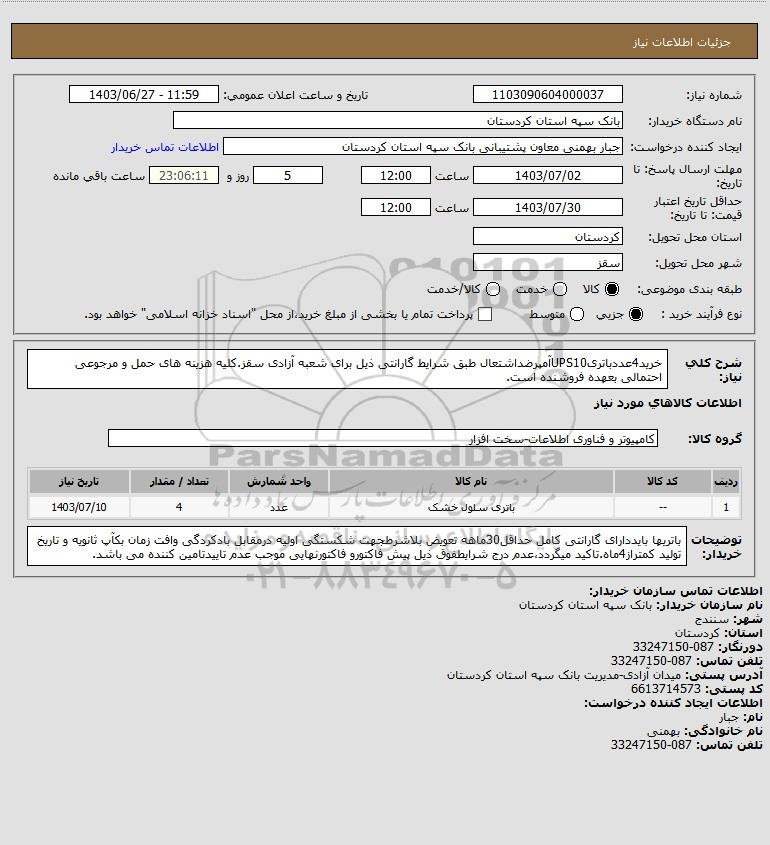شرح کلی نیاز: خرید4عددباتریUPS10آمپرضداشتعال طبق شرایط گارانتی ذیل برای شعبه آزادی سقز.کلیه هزینه های حمل و مرجوعی احتمالی بعهده فروشنده است.