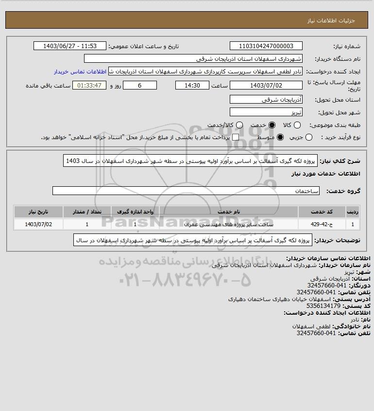 استعلام پروژه لکه گیری آسفالت بر اساس برآورد اولیه پیوستی در سطه شهر شهرداری اسفهلان در سال 1403, استعلام پروژه لکه گیری آسفالت بر اساس برآورد اولیه پیوستی در سطه شهر شهرداری اسفهلان در سال 1403