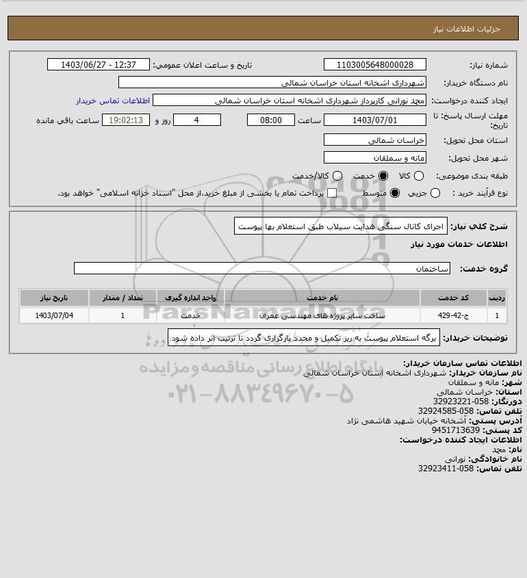 شرح کلی نیاز: اجرای کانال سنگی هدایت سیلاب طبق استعلام بها پیوست