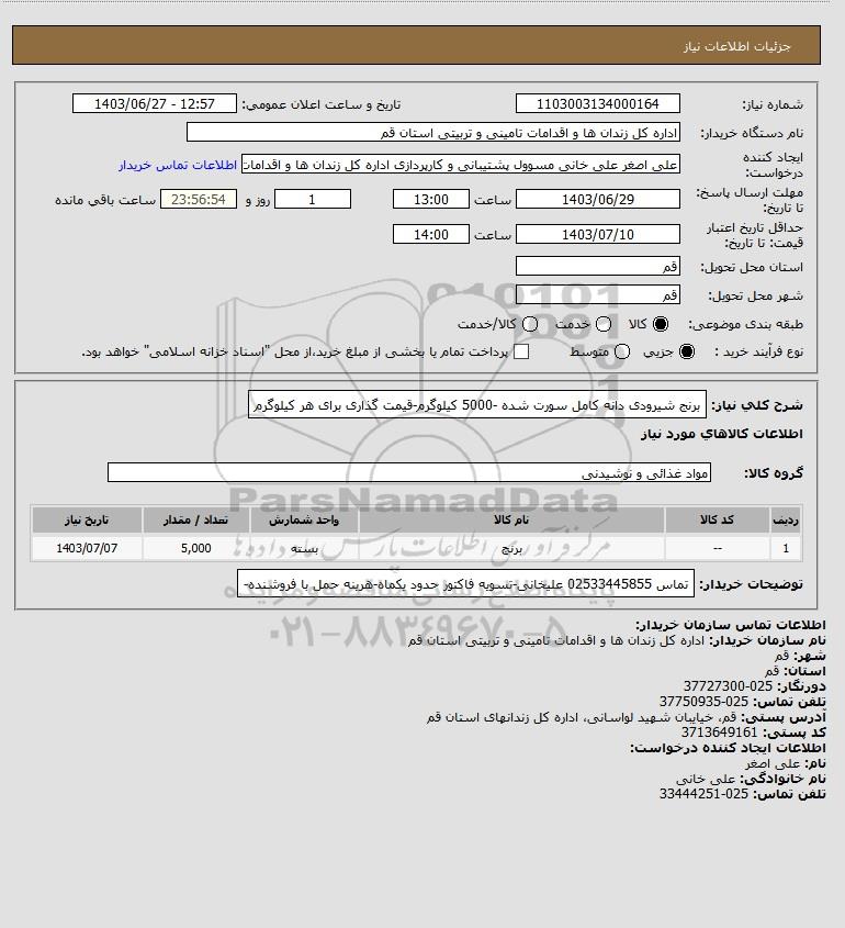 شرح کلی نیاز: برنج شیرودی دانه کامل سورت شده -5000 کیلوگرم-قیمت گذاری برای هر کیلوگرم