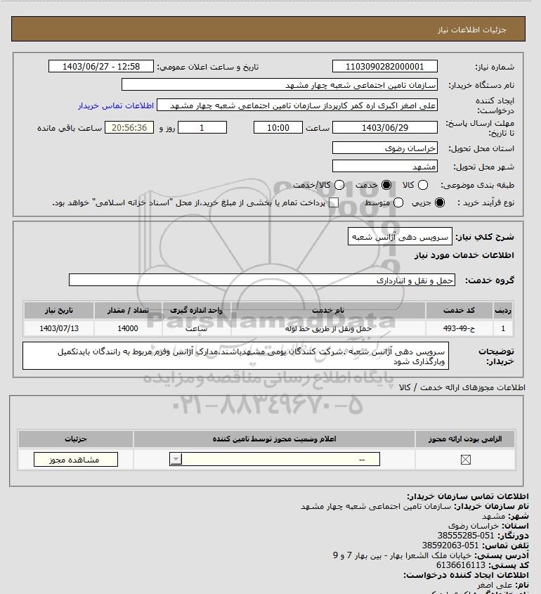 نام دستگاه خریدار:سازمان تامین اجتماعی شعبه چهار مشهد