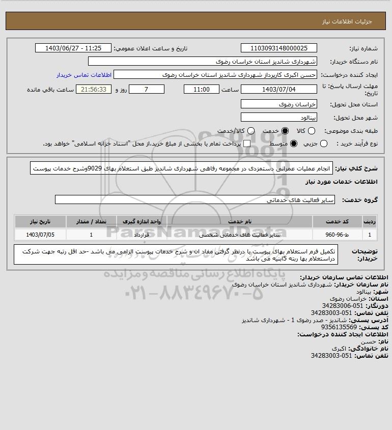 شرح کلی نیاز: انجام عملیات عمرانی دستمزدی در مجموعه رفاهی شهرداری شاندیز طبق استعلام بهای 9029وشرح خدمات پیوست