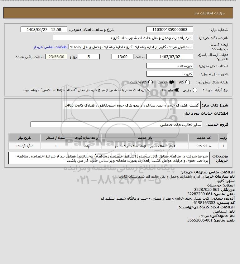 شرح کلی نیاز: گشت راهداری حریم و ایمن سازی راه محورهای حوزه استحفاظی راهداری کارون 1403