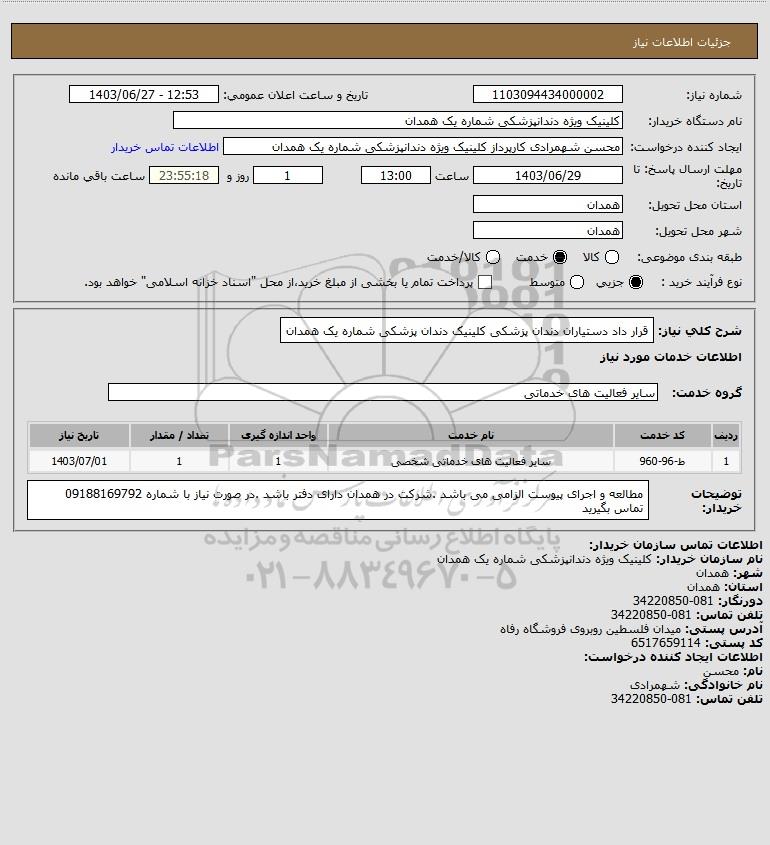 نام دستگاه خریدار:کلینیک ویژه دندانپزشکی شماره یک همدان