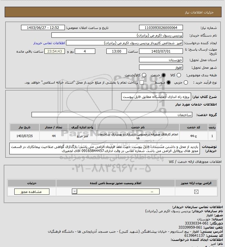 توضیحات خریدار:بازدید از محل و داشتن مستندات فایل پیوست جهت عقد قرارداد الزامی می باشد. بارگذاری گواهی صلاحیت پیمانکاری در قسمت مجوز های پروفایل الزامی می باشد. شماره تماس در وقت اداری 09165844457 آقای لجمیری