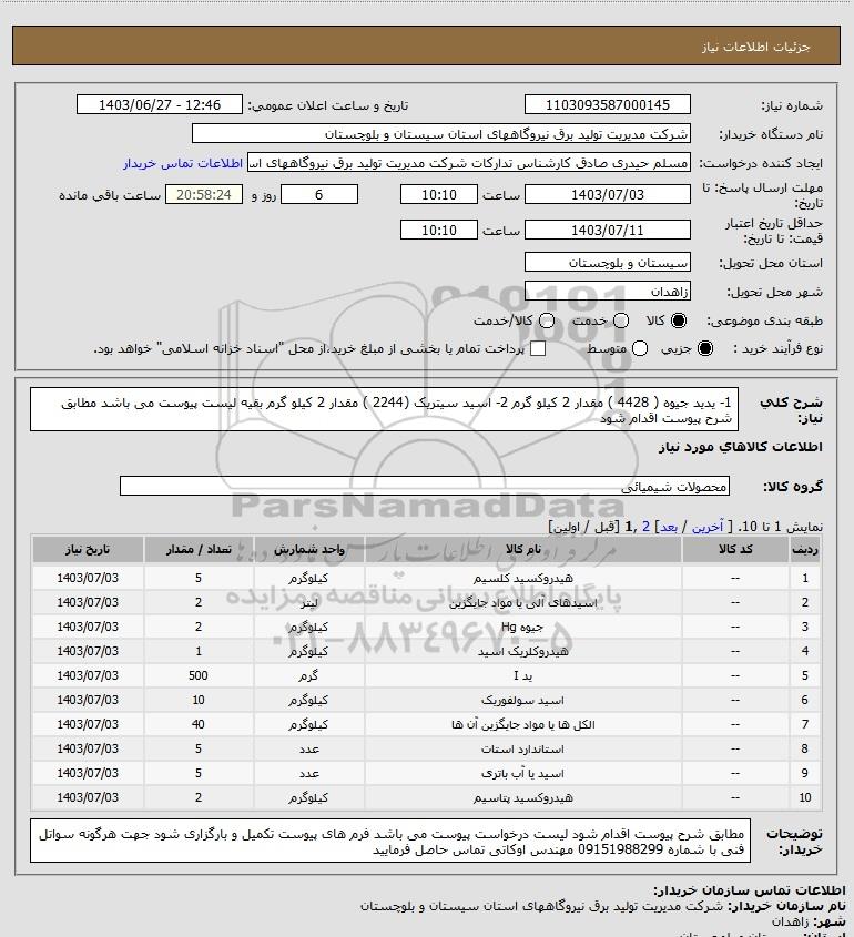شرح کلی نیاز: 1- یدید جیوه ( 4428 ) مقدار 2 کیلو گرم 2- اسید سیتریک (2244 ) مقدار 2 کیلو گرم بقیه لیست پیوست می باشد مطابق شرح پیوست اقدام شود