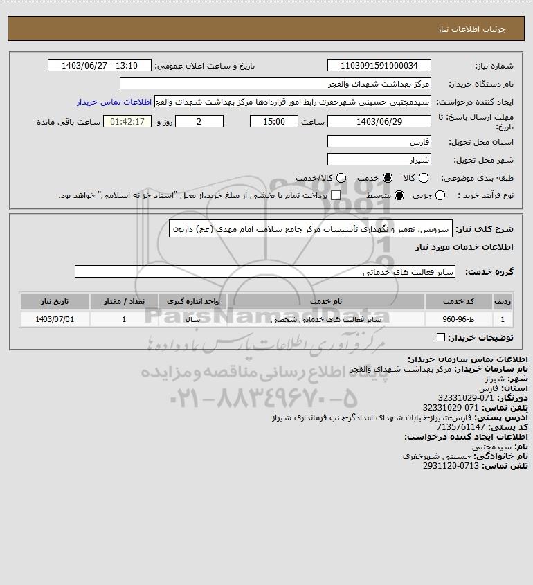 شرح کلی نیاز: سرویس، تعمیر و نگهداری تأسیسات مرکز جامع سلامت امام مهدی (عج) داریون