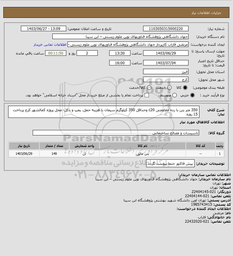شرح کلی نیاز: 350 متر بتن با رده مقاومتی c20 وحداقل 350 کیلوگرم سیمان
