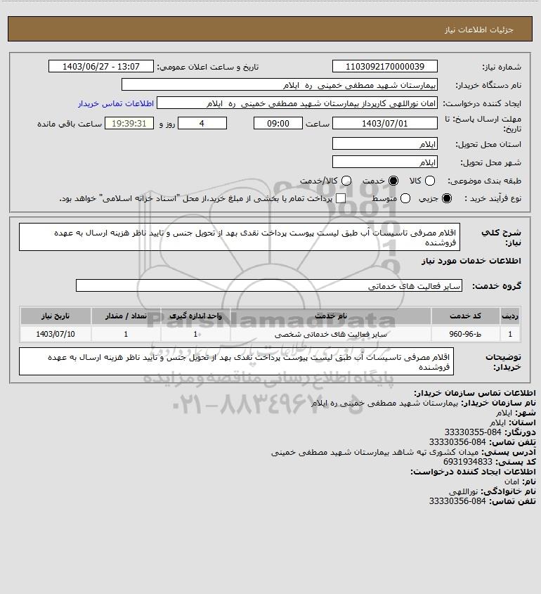 شرح کلی نیاز: اقلام مصرفی تاسیسات آب طبق لیست پیوست