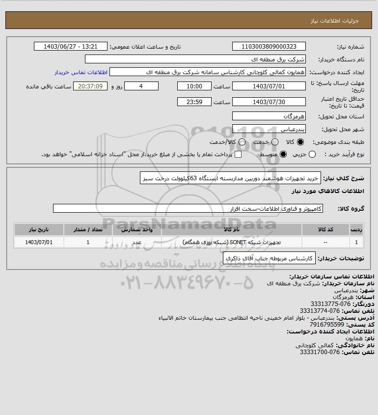 شرح کلی نیاز: خرید تجهیزات هوشمند دوربین مداربسته ایستگاه 63کیلوولت درخت سبز
