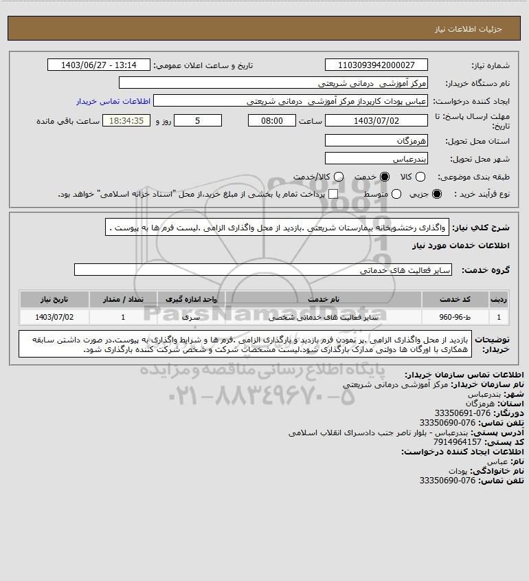 شرح کلی نیاز: واگذاری رختشویخانه بیمارستان شریعتی .بازدید از محل واگذاری الزامی .لیست فرم ها به پیوست .