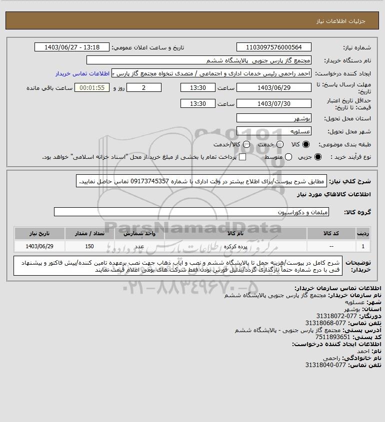 نام دستگاه خریدار:مجتمع گاز پارس جنوبی پالایشگاه ششم