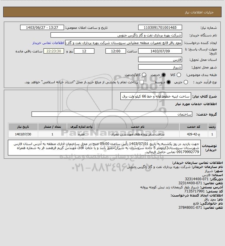 شرح کلی نیاز: ساخت ابنیه خطوط لوله و خط 66 کیلو ولت برق