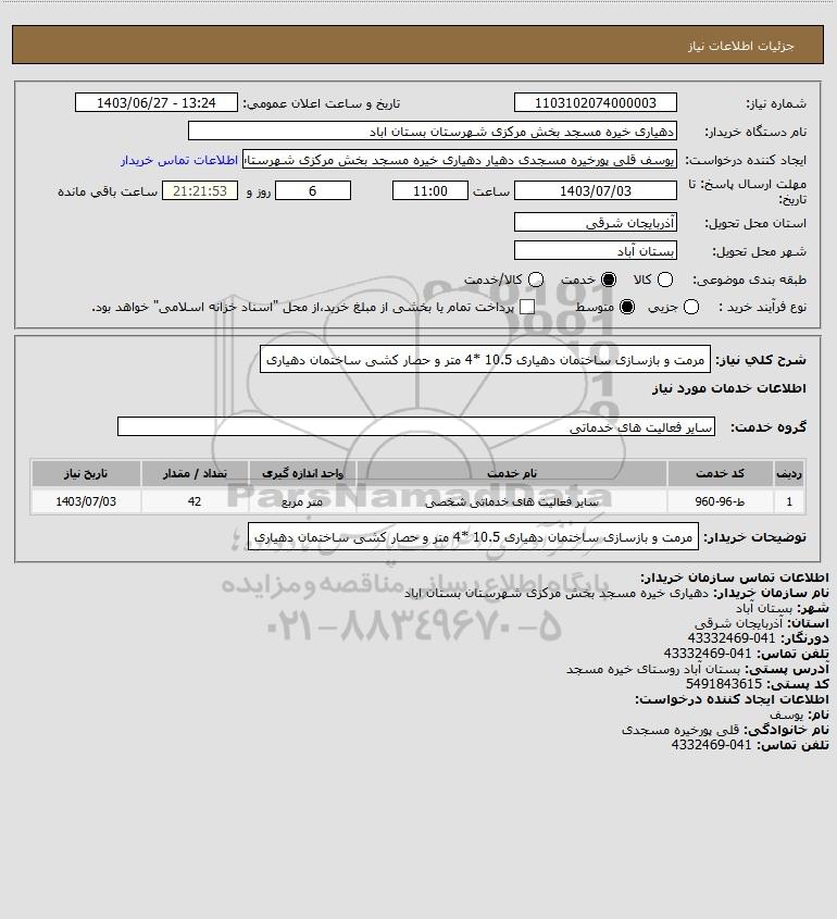 توضیحات خریدار:مرمت و بازسازی ساختمان دهیاری 10.5 *4 متر و حصار کشی ساختمان دهیاری