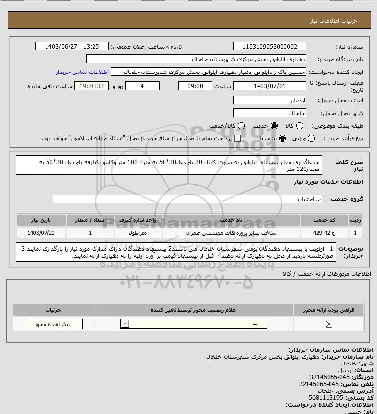 شرح کلی نیاز: جدولگداری معابر روستای ایلوانق به صورت کانال 30 باجدول30*50 به متراژ 100 متر وکانیو یکطرفه باجدول 30*50 به مقدار120 متر