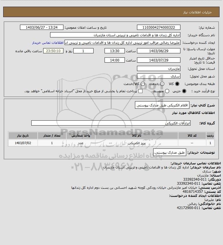 شرح کلی نیاز: اقلام الکتریکی طبق مدارک پیوستی