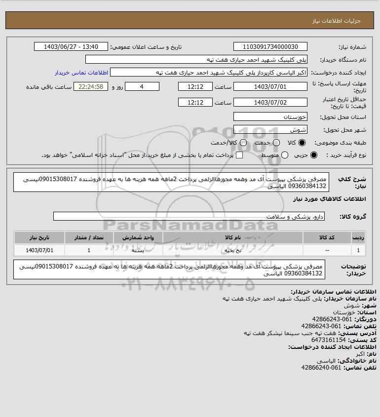 نام دستگاه خریدار:پلی کلینیک شهید احمد حیاری هفت تپه
