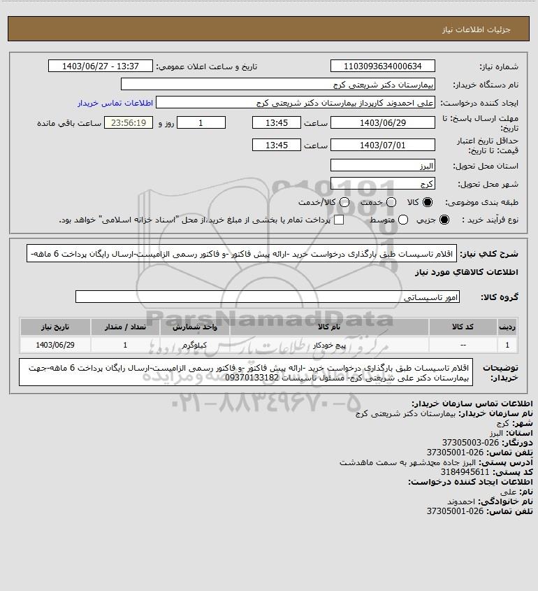 شرح کلی نیاز: اقلام تاسیسات طبق بارگذاری درخواست خرید -ارائه پیش فاکتور -و فاکتور رسمی الزامیست-ارسال رایگان پرداخت 6 ماهه-