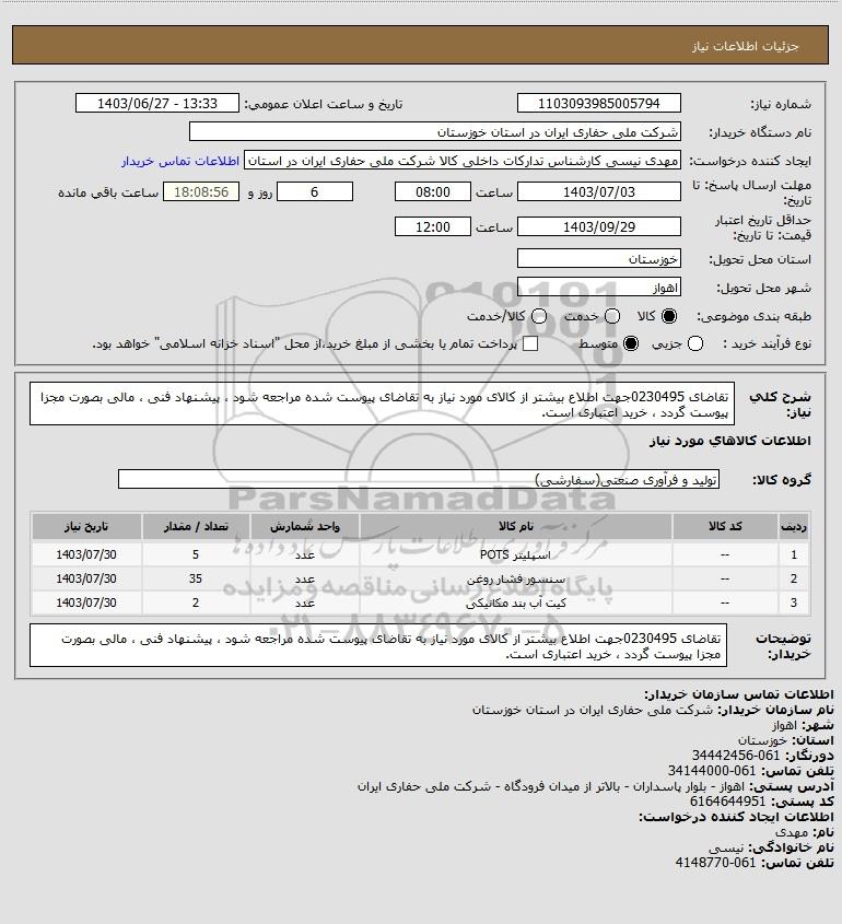 توضیحات خریدار:تقاضای 0230495جهت اطلاع بیشتر از کالای مورد نیاز به تقاضای پیوست شده مراجعه شود ، پیشنهاد فنی ، مالی بصورت مجزا پیوست گردد ، خرید اعتباری است.