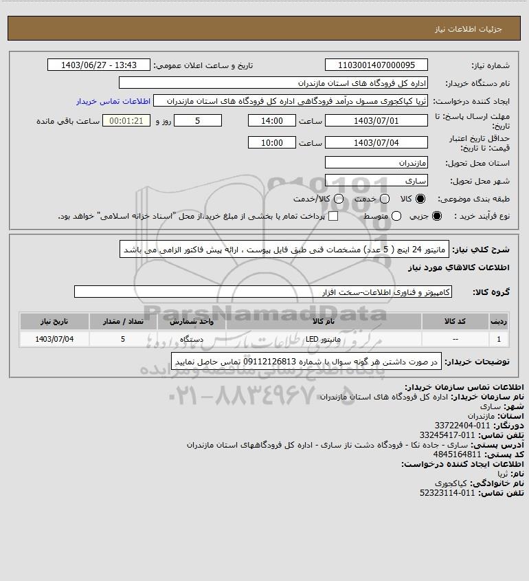 شرح کلی نیاز: مانیتور 24 اینچ ( 5 عدد) مشخصات فنی طبق فایل پیوست ، ارائه پیش فاکتور الزامی می باشد