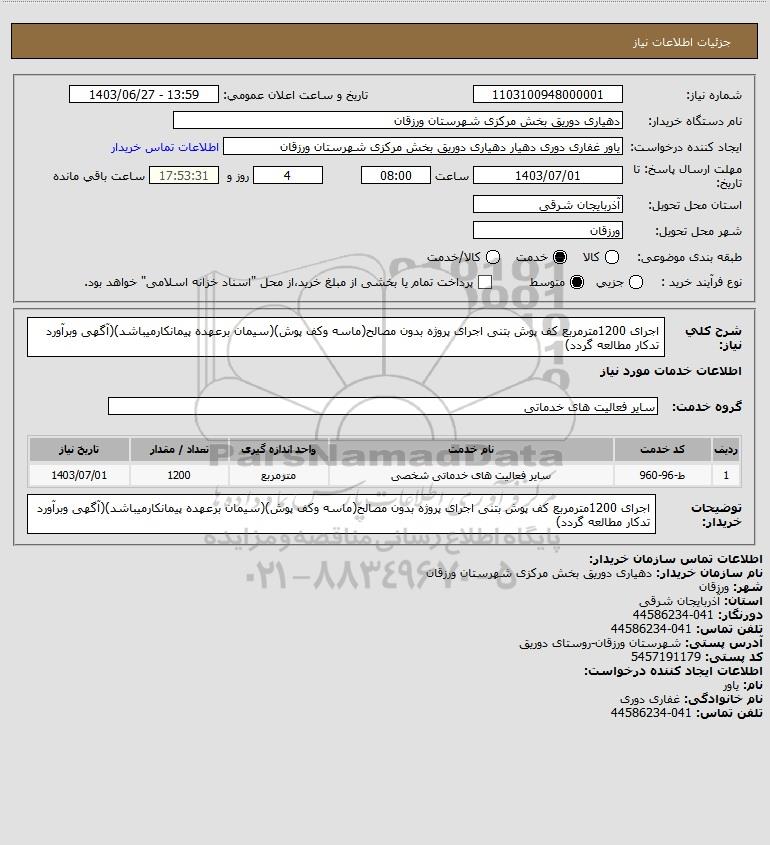 توضیحات خریدار:اجرای 1200مترمربع کف پوش بتنی اجرای پروژه بدون مصالح(ماسه وکف پوش)(سیمان برعهده پیمانکارمیباشد)(آگهی وبرآورد تدکار مطالعه گردد)