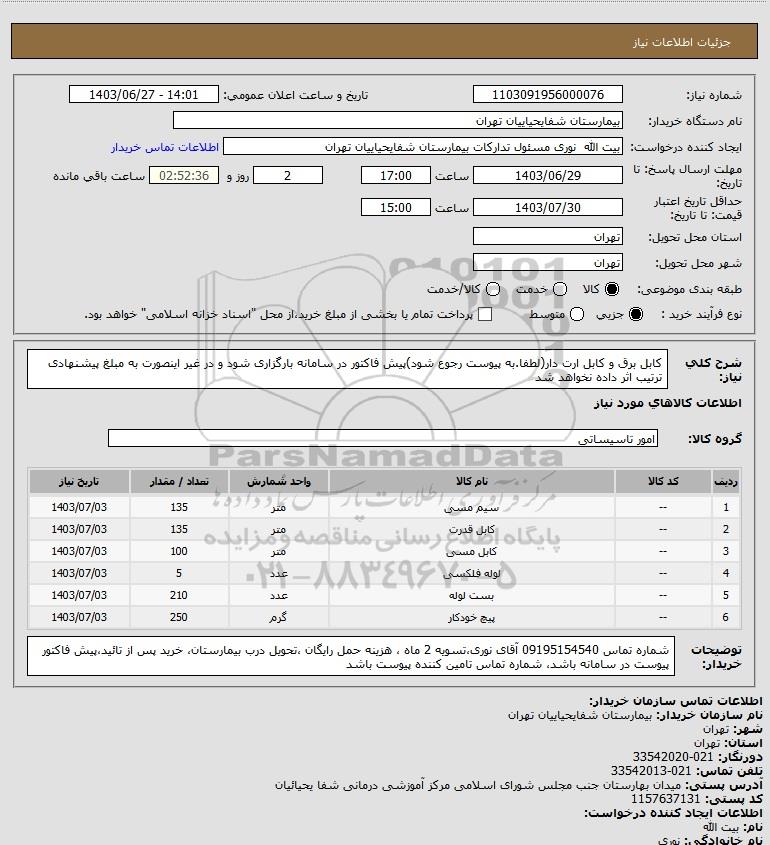 | 3 | -- | کابل مسی | متر | 100 | 1403/07/03 |