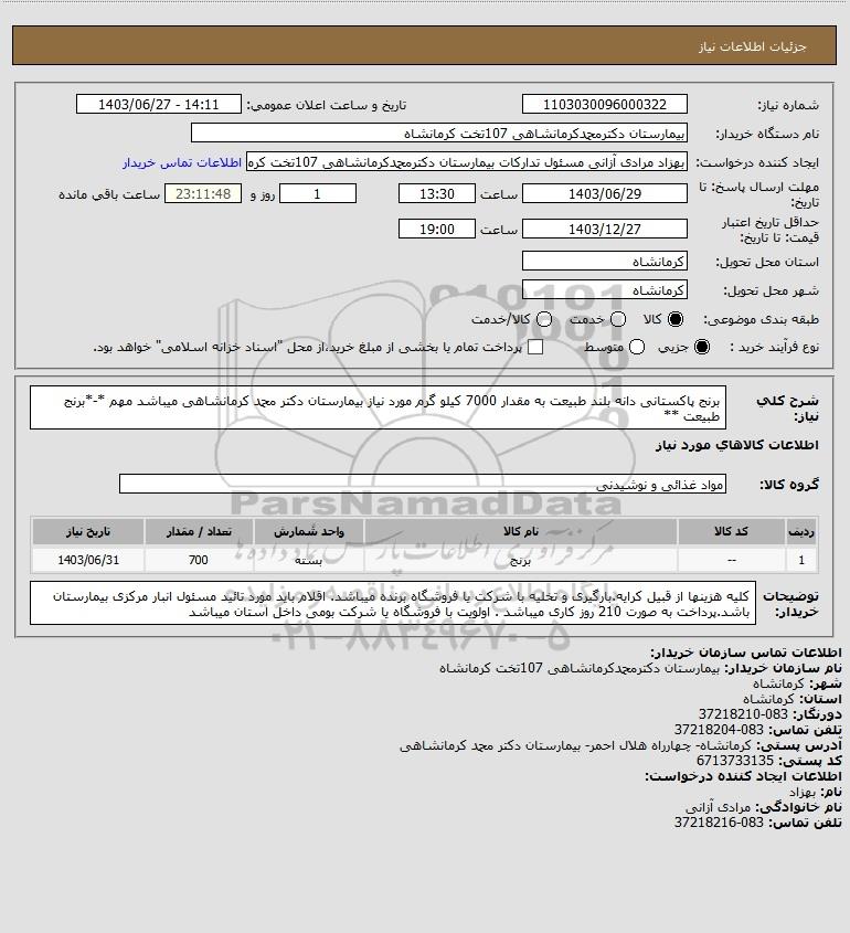 شرح کلی نیاز: برنج پاکستانی دانه بلند طبیعت به مقدار 7000 کیلو گرم مورد نیاز بیمارستان دکتر محمد کرمانشاهی میباشد