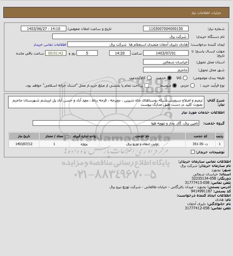 شرح کلی نیاز: ترمیم و اصلاح سرویس شبکه روستاهای چاه شیرین ، دوبرجه ، قرجه رباط ، محمد آباد و حسن آباد پل ابریشم شهرستان جاجرم بصورت کلید در دست طبق مدارک پیوست