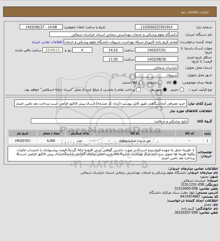نام دستگاه خریدار:دانشگاه علوم پزشکی و خدمات بهداشتی درمانی استان خراسان شمالی