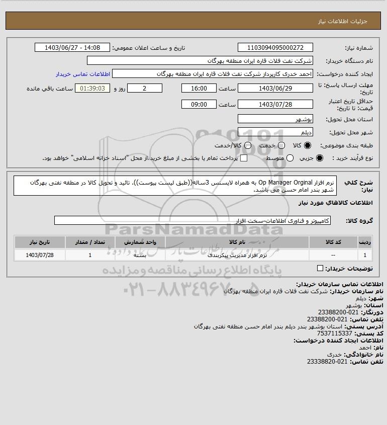استعلام بها و موضوع استعلام استعلام نرم افزار Op Manager Orginal به همراه لایسنس 3ساله((طبق لیست پیوست)). تائید و تحویل کالا در منطقه نفتی بهرگان شهر بندر امام حسن می باشد. به اطلاع کلیه شرکتها و افراد متخصص واجد شرایط میرساند، آگهی گذار در نظر دارد از طریق استعلام بها، نسبت به انتخاب و دریافت پیشنهادات اقدام نماید. این استعلام با کد آگهی ثبت شده در سامانه خبرگزاری پارس نماد : 8009652 منتشر شده است. مشخصات استعلام : تاریخ شروع استعلام: 1403/06/27 آخرین مهلت ارسال پیشنهاد قیمت : 1403/06/29 و محل اجرای پروژه : استان بوشهر میباشد. استعلام قیمت مورد درخواست : استعلام نرم افزار Op Manager Orginal به همراه لایسنس 3ساله((طبق لیست پیوست)). تائید و تحویل کالا در منطقه نفتی بهرگان شهر بندر امام حسن می باشد. با دستهبندیهای تخصصی و گروه های مرتبط : کامپیوتر, اتوماسیون اداری, استعلام اطلاع رسانی میگردد.