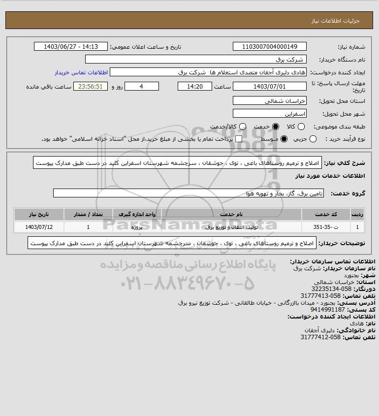 توضیحات خریدار:اصلاح و ترمیم روستاهای باغی ، توی ، جوشقان ، سرچشمه شهرستان اسفراین کلید در دست طبق مدارک پیوست