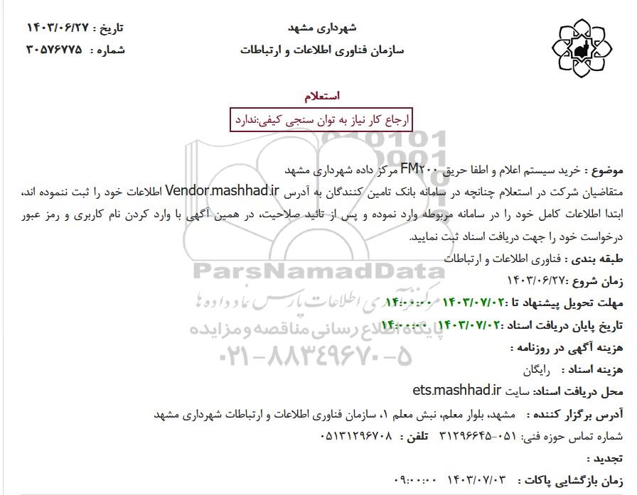 موضوع : خرید سیستم اعلام و اطفا حریق FM200 مرکز داده شهرداری مشهد