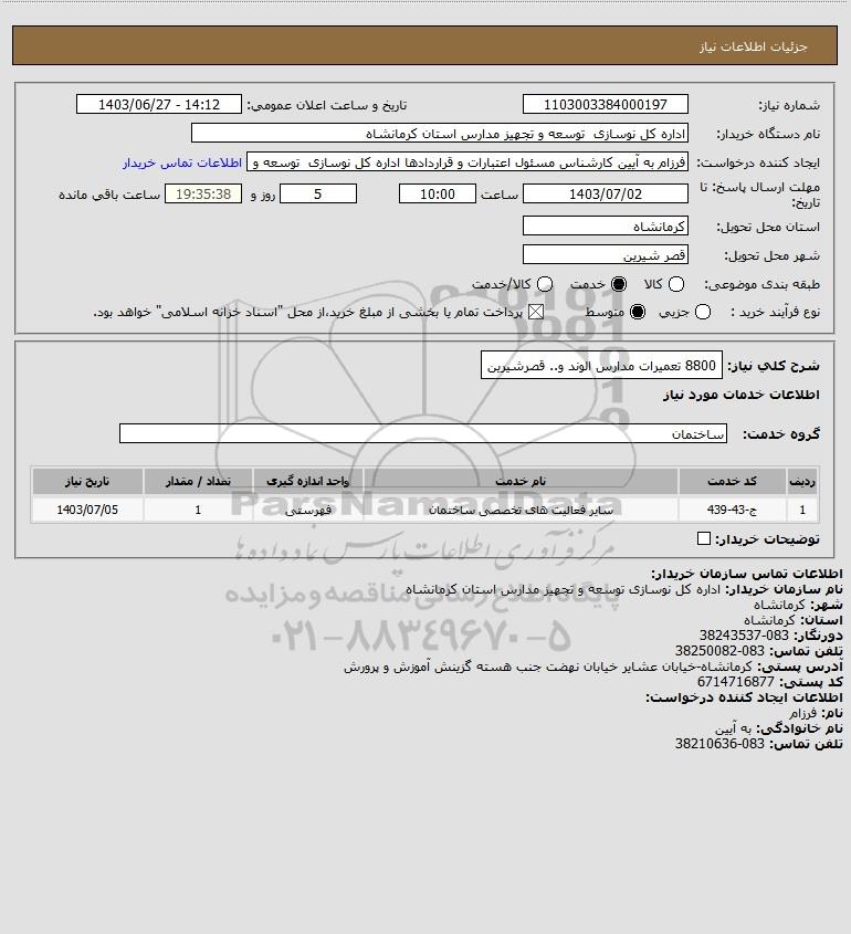 شرح کلی نیاز: 8800 تعمیرات مدارس الوند و.. قصرشیرین