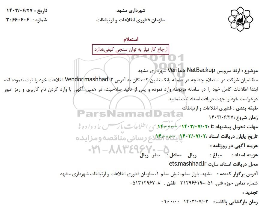 استعلام ارتقا سرویس Veritas NetBackup شهرداری, استعلام ارتقا سرویس Veritas NetBackup شهرداری